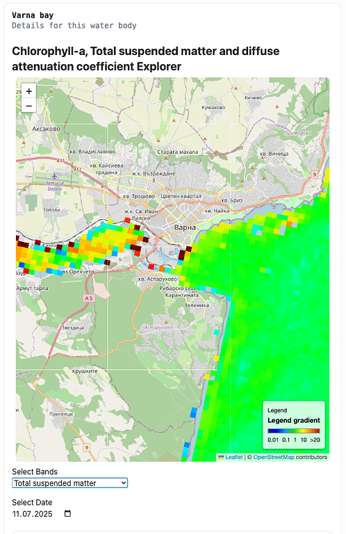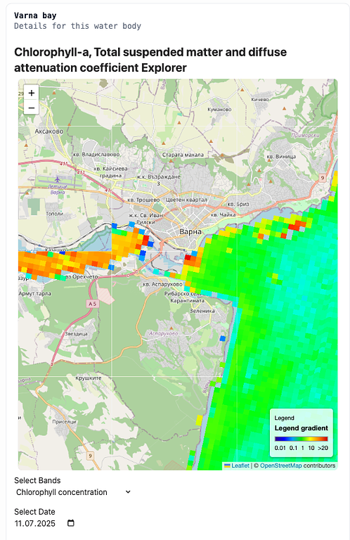 The screenshot above highlights chlorophyll-a levels across the Varna Bay area. Several localized zones display elevated concentrations. One hotspot appears within the Varna Harbour—expected due to limited circulation and anthropogenic activity. However, two additional high-chlorophyll zones were detected offshore near the “кв. Виница” (Vinitsa district). With support from local residents, we identified suspected illegal wastewater discharge points near these elevated chlorophyll concentrations.